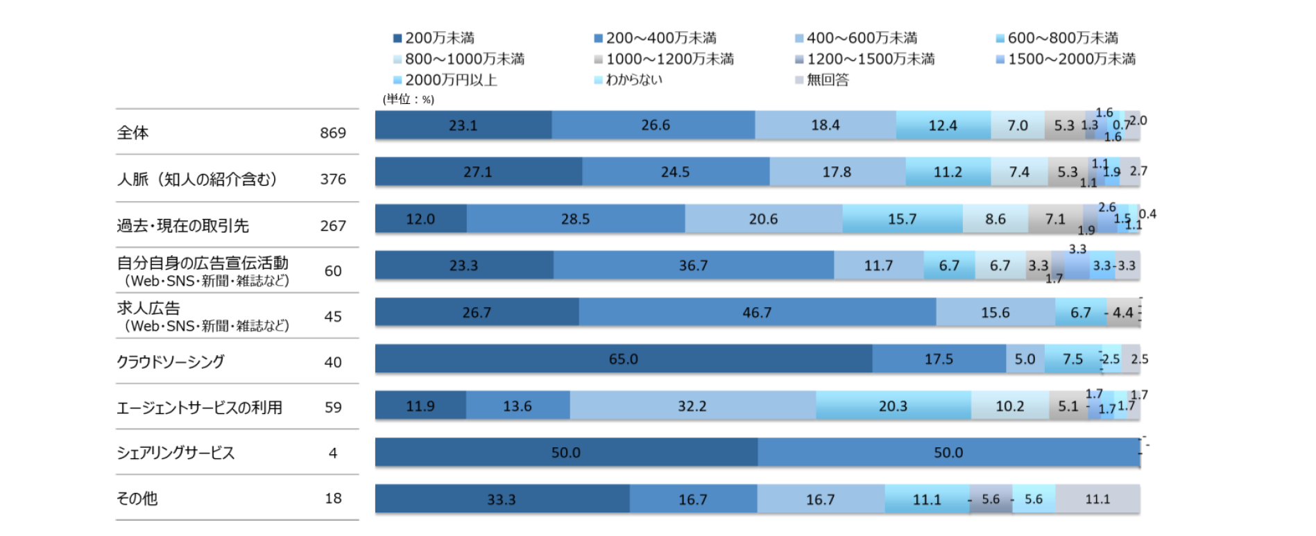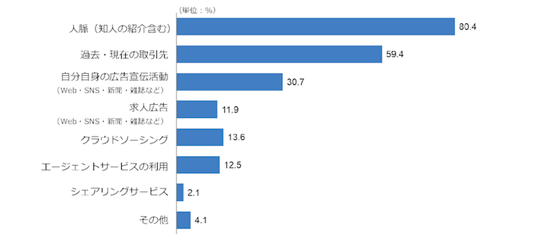 多くのフリーランスの方は、人脈(知人の紹介含む)、過去・現在の取引先から仕事を取ることが多いようです。(フリーランス白書11p参照)
