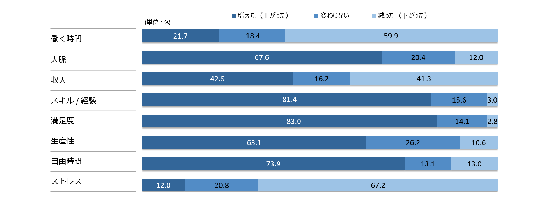 会社員時代に 比べて、増えた(上がった)/減った(下がった)ものに関しては、満足度、スキル/経験、生産性、人脈は増え、ストレスや働く時間は減った方が多いようです。(フリーランス白書14p参照)