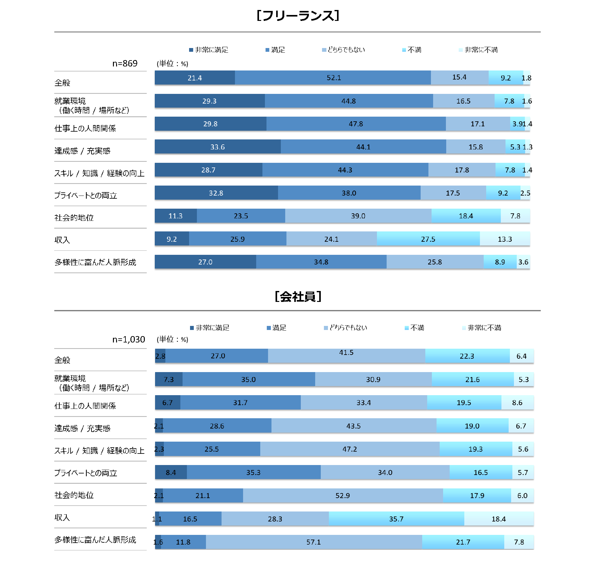 会社員の方との比較では、社会的地位を除く全ての項目において、会社員よりもフリーランスの方が満足度が高いようです。(フリーランス白書34p参照)