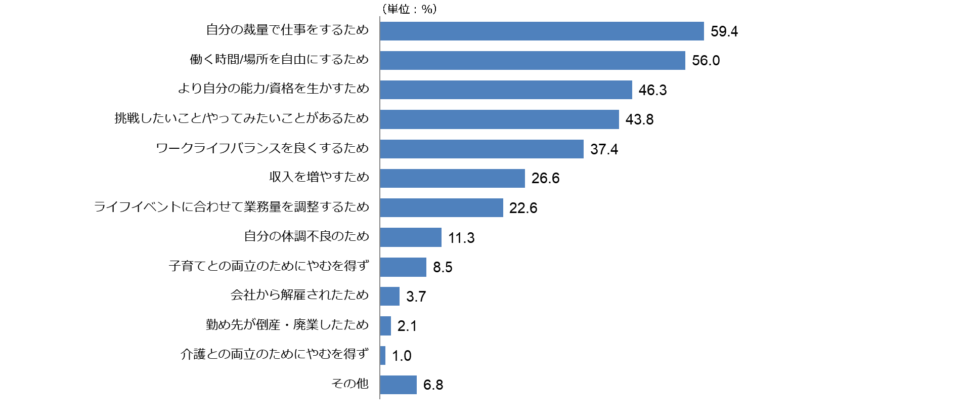 因みに収入を増やすためは26.6%で少し意外でした。自由、スキルアップ、やりがい、など働き方をよりよくしたい人が多いようです。フリーランスは仕事も自由に選べる分、しっかりと目的や目標を持ち、ブレずにやっていくことが大切です。